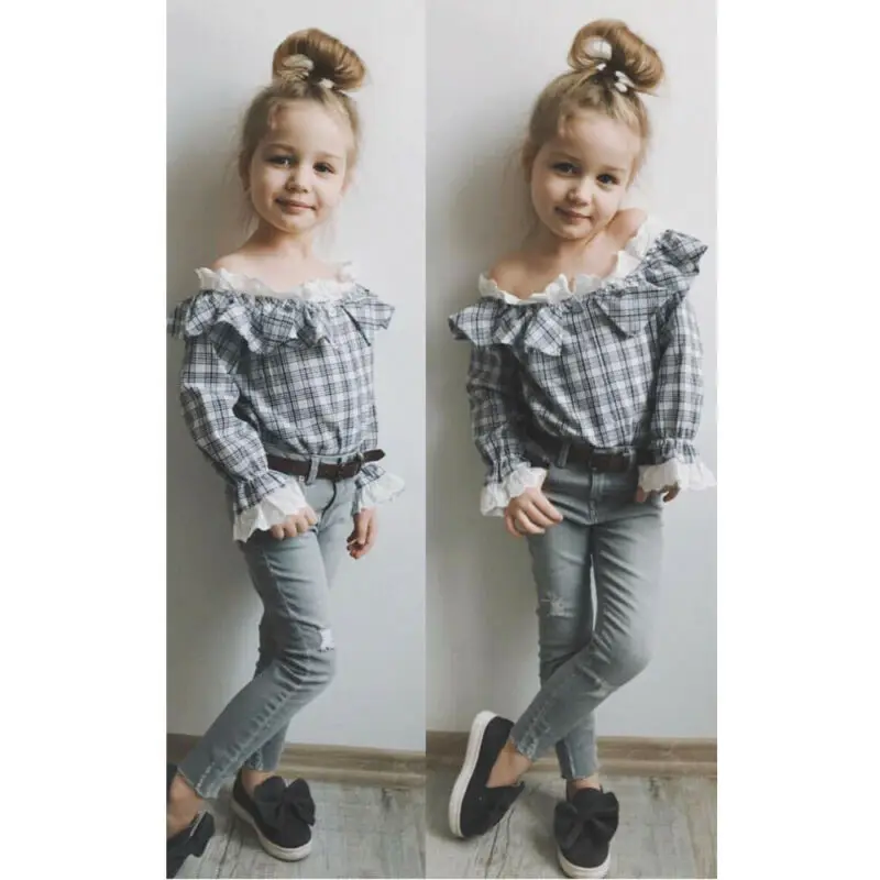 Limited Price of 2-7T Toddler Kid Baby Girl Children Autumn Clothes Sets Plaid Long Sleeve Tops Long Pants Jeans 2pc